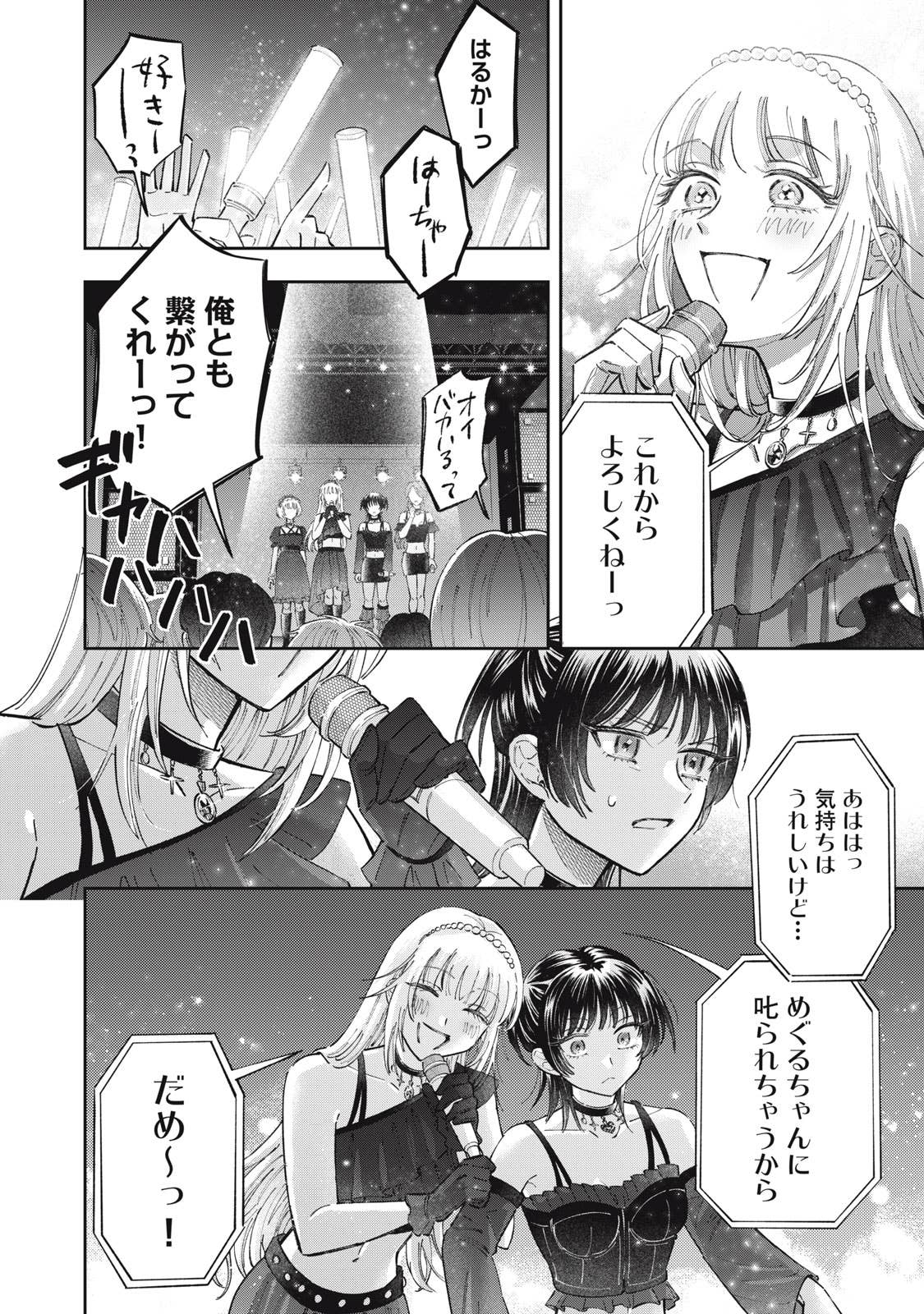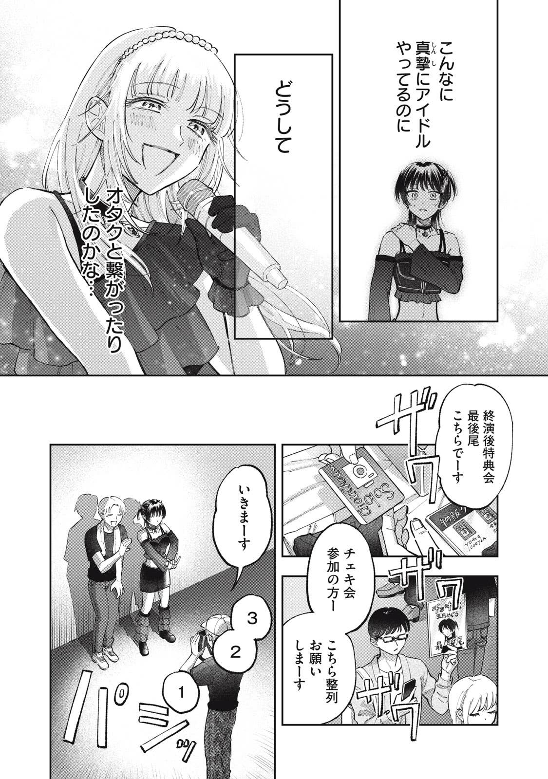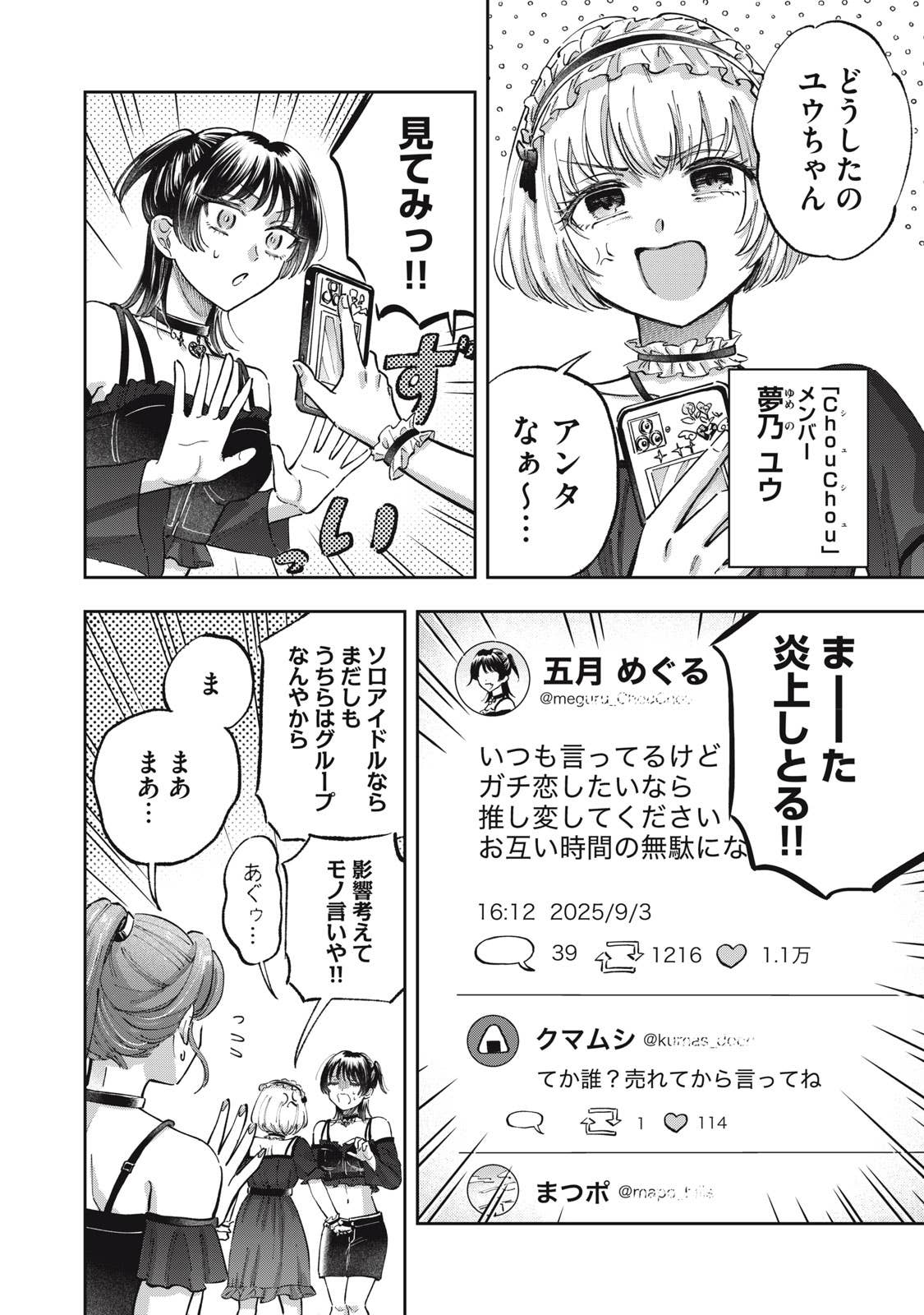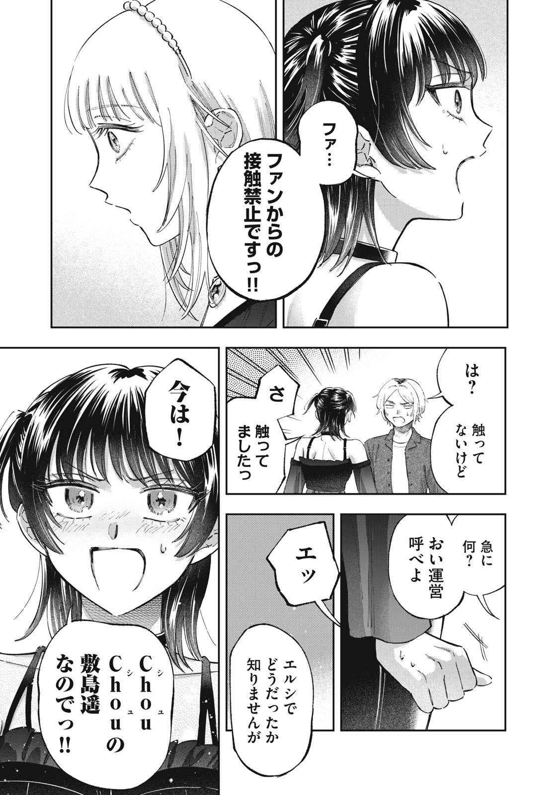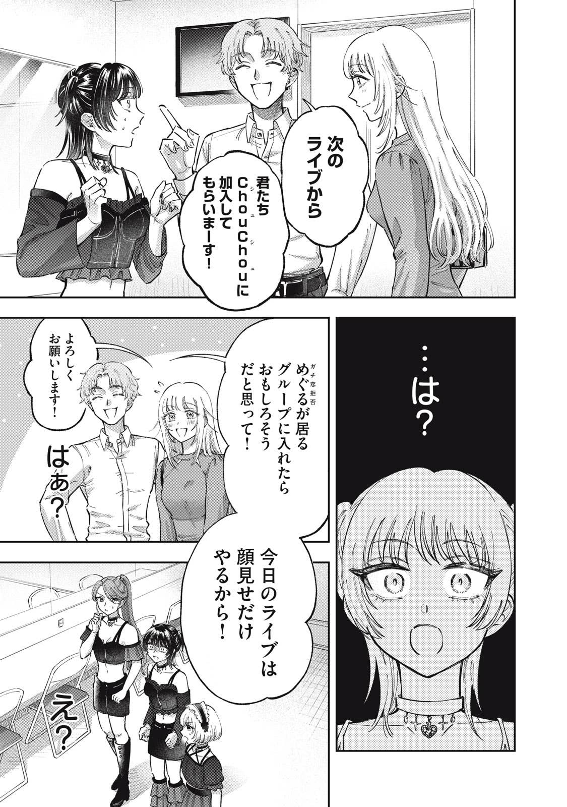 推しがことごとくオタクと繋がって(交際して)引退してしまう、かわいそうなアイドルオタクの五月めぐるは、自分自身が”ガチ恋厳禁”の皆が安心して応援できるアイドルになればいいという理論に辿り着き、アイドルグループ「ChouChou」としてデビューする。しかしそこに新加入メンバーとして現れたのは、かつてファンとの繋がりが噂されたアイドル・敷島遥で‥‥。